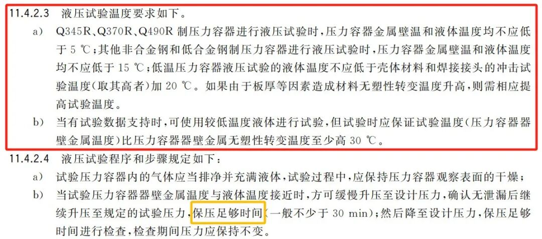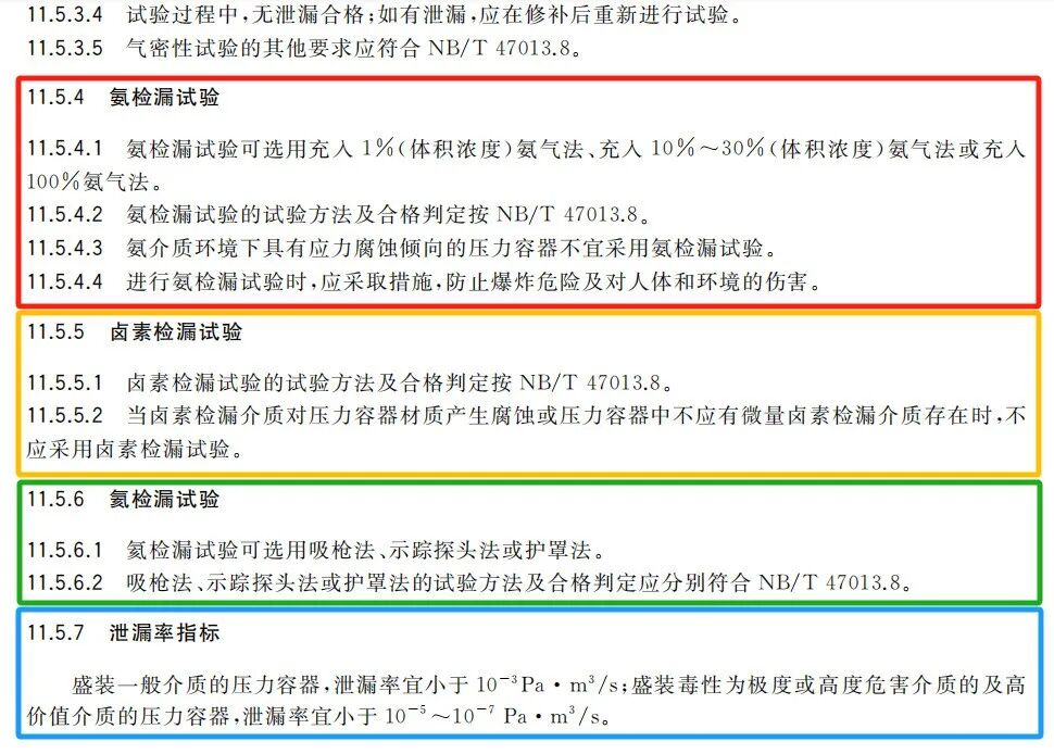 1)更改了对耐压试验时试验温度(含压力容器金属壁温、试验用液体和气体的温度)的规定 (见11.4.2.3,2011年版的11.4.9.3);2)增加了对泄漏试验时机的规定(见11.5.2);3)更改了对氨检漏试验的规定(见11.5.4,2011年版的11.5.4);4)更改了对卤素检漏试验的规定(见11.5.5,2011年版的11.5.4);5)更改了对氦检漏试验的规定(见11.5.6,2011年版的11.5.4);6)增加了对压力容器泄漏率的规定(见10.5.7)。