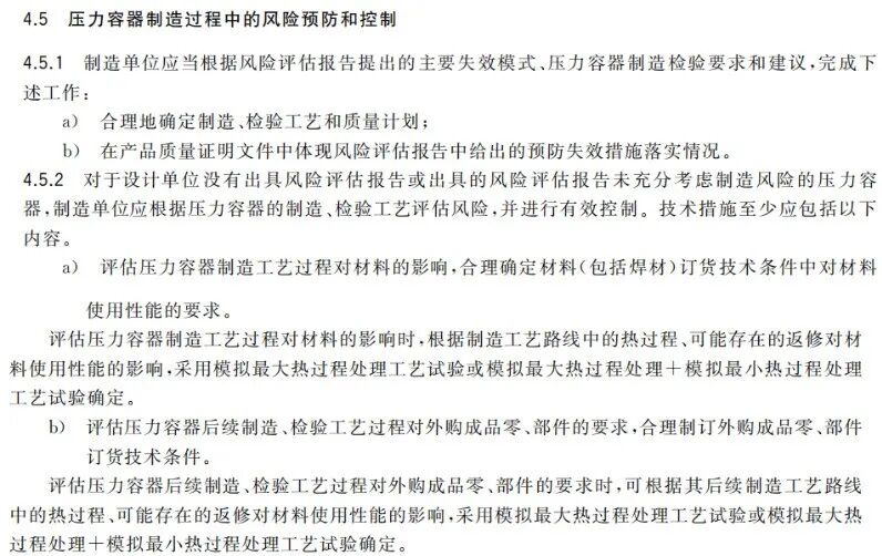4)更改了压力容器制造过程中风险预防和控制的规定(见4.5,2011年版的4.2)。