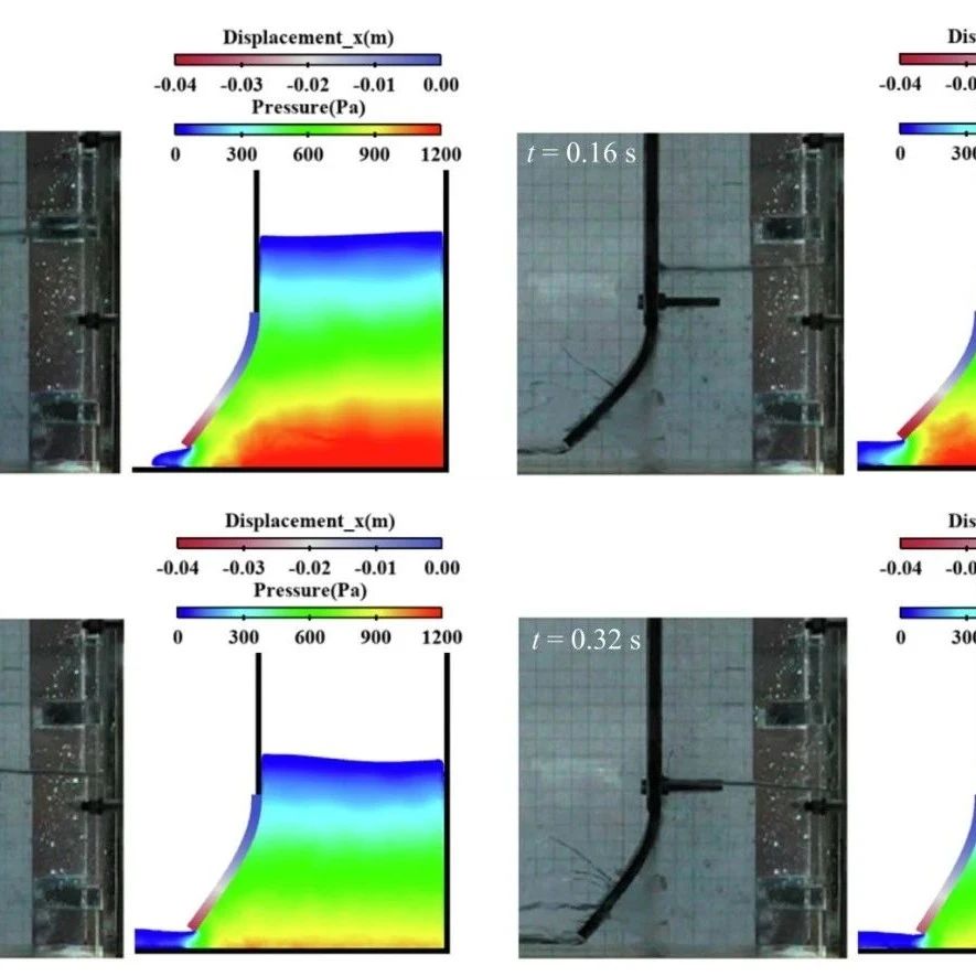 文一: 用光滑粒子流体动力学模拟范德华力:在薄液膜破裂中的应用摘要:范德华力驱动的薄液膜破裂在许多工程过程中具有重要意义,以往的研究大多依赖于润滑近似。在本文中,我们发展了范德华力的光滑粒子流体动力学(SPH)表示,并利用润滑理论模拟了薄液膜的破裂。SPH中的范德华力仅施加在一层上,即流体颗粒的最外层,其中使用加权函数来评估界面上或界面附近颗粒的贡献。然而,为了获得对范德华力的精确静水压力,加权函数的计算所使用的平滑长度比大块流体的SPH离散所使用的光滑长度更小。同样的表面粒子也用于对表面张力进行建模。为了处理具有非常小的纵横比raε(ε=厚度/长度)的薄液膜的破裂,引入坐标变换来收缩液膜的长度,以实现具有可管理数量的粒子的精确数值分辨率。作为对物理模型和数值算法的验证,我们模拟了静止膜中的静水压力和初始方形液滴的弛豫,并将SPH结果与解析解进行了比较。然后将该方法应用于模拟中等和小纵横比(ε=0.5和0.005)的薄液膜的破裂。通过将粒子间距细化到四个不同的水平来验证该方法的收敛性。分析了毛细管数对破裂过程的影响。 图:范德华力fv的示意图:力的方向垂直于基底。 图:(a)光滑曲面和(b)动态变形曲面的加权函数 λ。 图:最小膜厚度的跳跃现象在两个连续的时间步长(t=13.7和13.7001)。在这个图中,最外层的流体颗粒的层用红圈表示,而内部颗粒是黑圈。文二:大变形破裂流固耦合问题的 PD-SPH 耦合建模摘要:提出了一种基于虚拟粒子和排斥力的简单而精确的耦合周动力学(PD)和光滑粒子流体动力学(SPH)策略来模拟大变形和压裂的流体-结构相互作用(FSI)问题。为了处理流体-结构界面区,将流体颗粒支撑域内的周动力学颗粒视为虚拟颗粒,通过虚拟颗粒确保流体颗粒的全核支撑,可以对流体颗粒施加不同的边界条件,并施加防止渗透的排斥力。对于动量守恒,作用在流体粒子上的周动力学粒子同时受到相反的力。已经对涉及大变形和破裂的纯固体结构的周动力学模型和FSI的耦合PD-SPH模型进行了验证研究,所有这些都与分析解、可用的实验数据和/或其他数值结果非常一致。最后,将所提出的方法用于研究水射流岩石破碎问题,结果进一步表明,所提出的耦合PD-SPH模型能够处理流体诱导固体破碎的复杂FSI问题。 图:近场动力学颗粒之间相互作用的示意图。 图:固定固体边界的CD-SBT算法图解。 图:PD-SPH耦合方案示意图。 图:悬臂梁的初始几何形状。(a) 初始几何模型;(b) 近场动力学模型。 图:集中荷载F为8kN时有限元结果与近场动力学模拟结果的比较。(a)&(b)是FEM给出的水平和垂直位移,(c)和(d)是近场动力学给出的相应结果。 图:弹性板上静水柱的初始几何形状和PD-SPH模型。(a) 初始几何模型;(b) PD-SPH耦合模型。 图:实验结果与现有模拟的比较。 图:弹性闸门自由端位移的比较。(a)水平位移; (b)垂直位移。 图:工况I的水力裂纹扩展路径和失效模式。(a)t=0.67ms;(b) t=1.0毫秒;(c) t=1.2毫秒;(d) 实验结果 图:岩石损伤场的演化过程。(a) t=0:2 微秒;(b) t=5 微秒;(c) t=10 微秒;(d) t=15 微秒。文三:波浪-浮冰相互作用和过冲的无网格粒子法数值研究摘要:在某些波浪条件下,规则波浪和浮冰之间的相互作用涉及过冲,其特征是波浪在具有大变形自由表面的浮冰表面上流动。采用内部移动粒子半隐式(IMPS)方法来模拟波浪与浮冰的相互作用,特别是对于特定的行为,即由于海冰的小干舷和大的物体运动而产生的过冲。在这项工作中,使用基于斯托克斯波理论的拉格朗日粒子方法生成了一系列规则波。将浮冰模型简化为不带和带边缘屏障的圆盘和带中心孔的圆盘,可用于研究过冲的影响。分析了规则波浪条件下不同波长和恒定波高下浮冰的水动力响应。与基于网格的方法相比,基于拉格朗日粒子的方法在处理波浪过冲过程中高度变形的自由表面方面具有优势。活塞式造波器和海绵层分别用于产生波浪和避免波浪从壁边界反射。验证包括直径400 mm、厚度15 mm的圆形浮冰与波长λ/D为1.5至3.5的规则波相互作用。将原始圆盘的RAO与带有边缘屏障和中心孔的圆盘的RAOs进行了比较。浮冰上的过度冲刷可以通过使用边缘屏障来防止。提出并模拟了一种新型的过冲,即波浪在上表面流动,然后进入孔中。目前的数值预测结果与实验数据和使用CFD代码Flow-3D公布的数值结果非常一致。 图:造波器和海绵层。 图:计算区域、边界条件和坐标系示意图。 图:用于验证的水槽两点处波浪高度的时间历程。 图:(a) t = 7.0 s 和(b) t = 7.4 s 时 λ/D = 2.5的波的自由面。 图:三块浮冰的涌浪、起伏和俯仰运动的时间序列。 图:模型1自由曲面的四个典型瞬时(λ/D = 1.5)。 图:不同波长下三种模型的溢流比较。 图:三种不同波长模型的压力场比较。文四: 基于三维拉格朗日无网格投影的水弹性流体-结构相互作用求解器摘要:本文提出了一种三维完全拉格朗日无网格求解器,用于再现与不可压缩流体流和弹性结构相对应的流体-结构相互作用(FSI)。基于投影的粒子方法,即运动粒子半隐式(MPS),与基于哈密顿粒子的结构模型(称为哈密顿MPS(HMPS)结构模型)相耦合。HMPS结构模型是在哈密顿力学的框架下通过考虑粒子系统的拉格朗日量来配置的,从该拉格朗日量可以通过变分原理导出非线性弹性动力学的运动方程。通过四个基准试验验证了HMPS结构模型的稳定性、准确性和