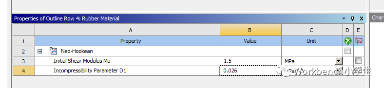 点击Click here to add new material,输入Rubber Material,在左侧Hyperelastic栏下双击Neo-Hookean,在Initial Shear Modulus栏下输入1.5,在Incompressibility Parameter D1 Value栏下输入0.026.