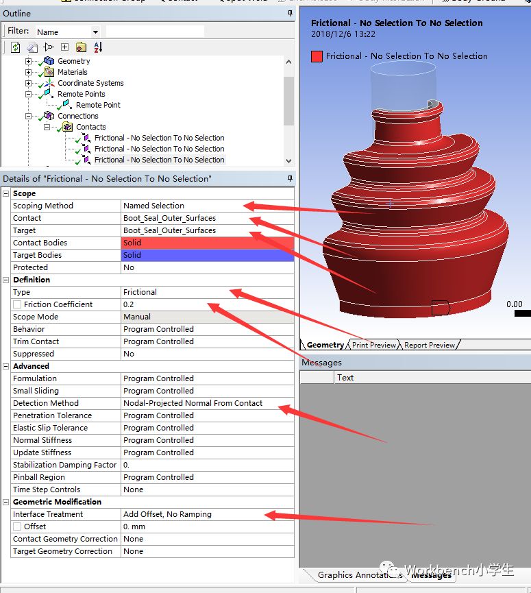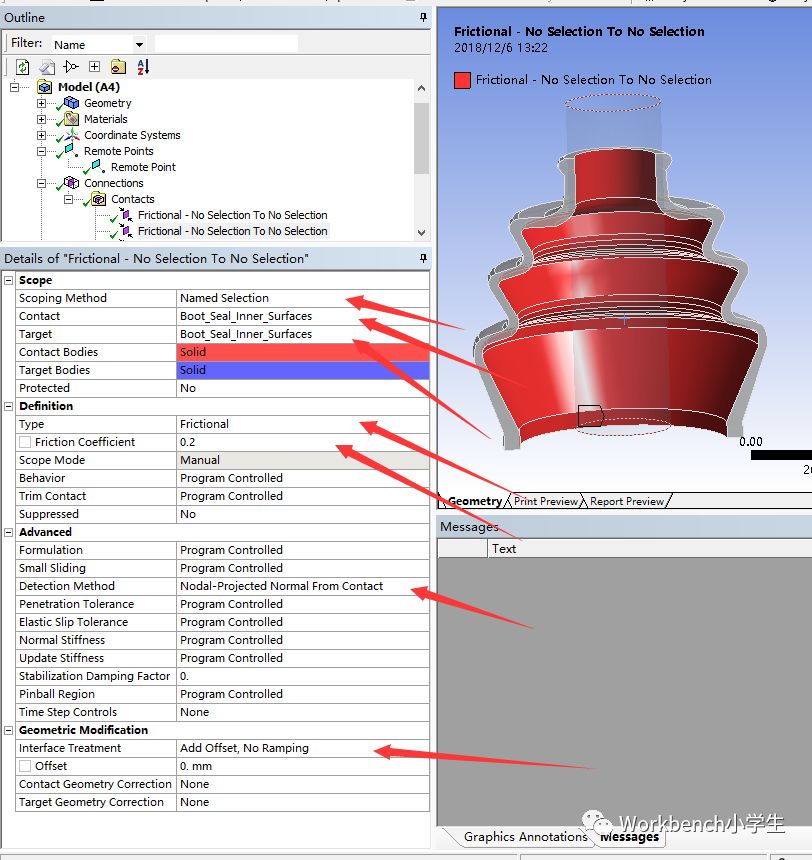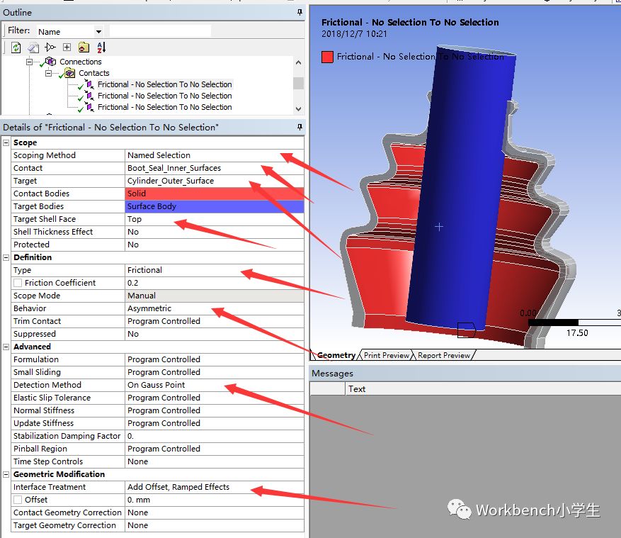 (1)选择Frictional接触方式,Scoping Method设置为Named Selections,Contact设置为Boot_Seal_Inner_Surfaces,Target设置为Cylinder_Outer_Surface,Target Shell Face设置为Top,Frictional Coefficient Value输入0.2,Set Behavior设置为Asymmetric,Detection Method设置为On Gauss Point,Interface Treatment设置为 Add Offset, Ramped Effects。