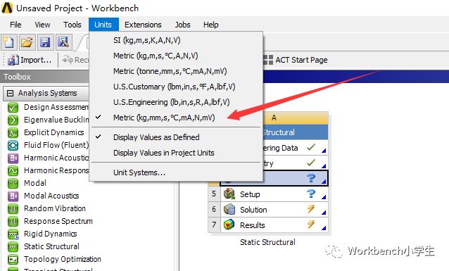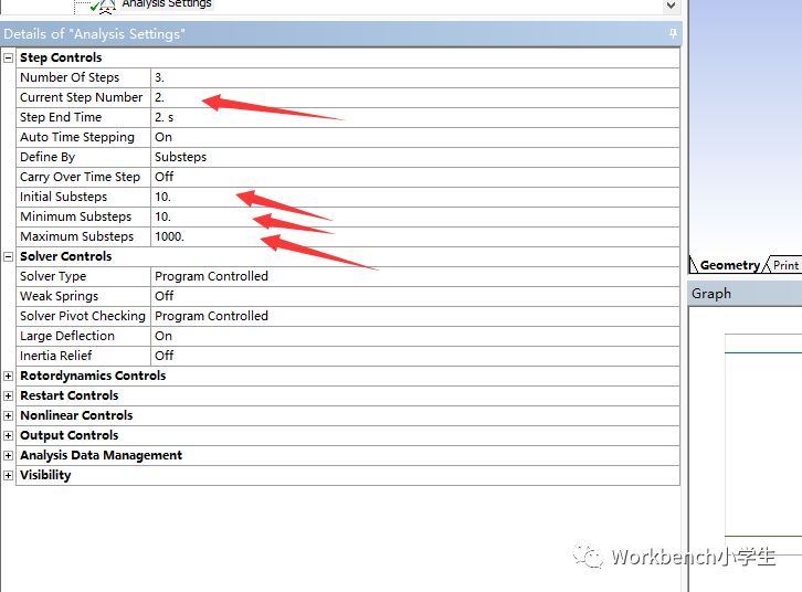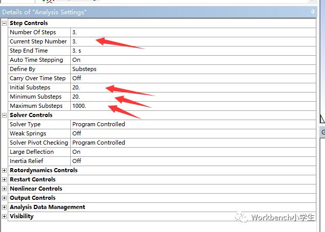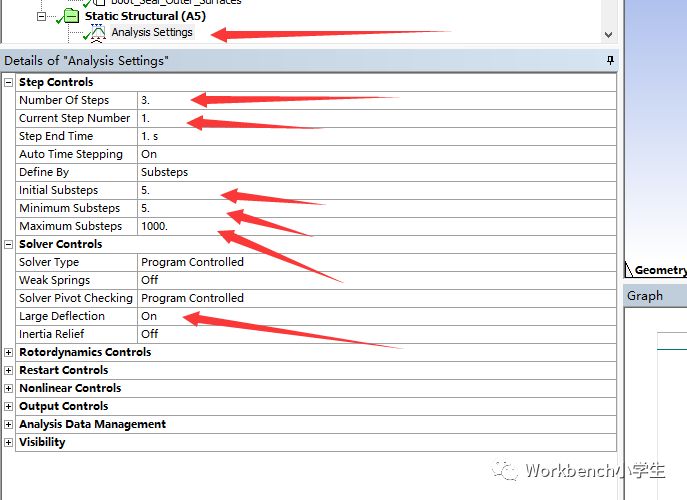 Number of Steps设置为3,Auto Time Stepping设置为On,Define By设置为 Substeps,Initial Substeps和Minimum Substeps 设置为5,Maximum Substeps设置为1000,Large Deflection设置为On。