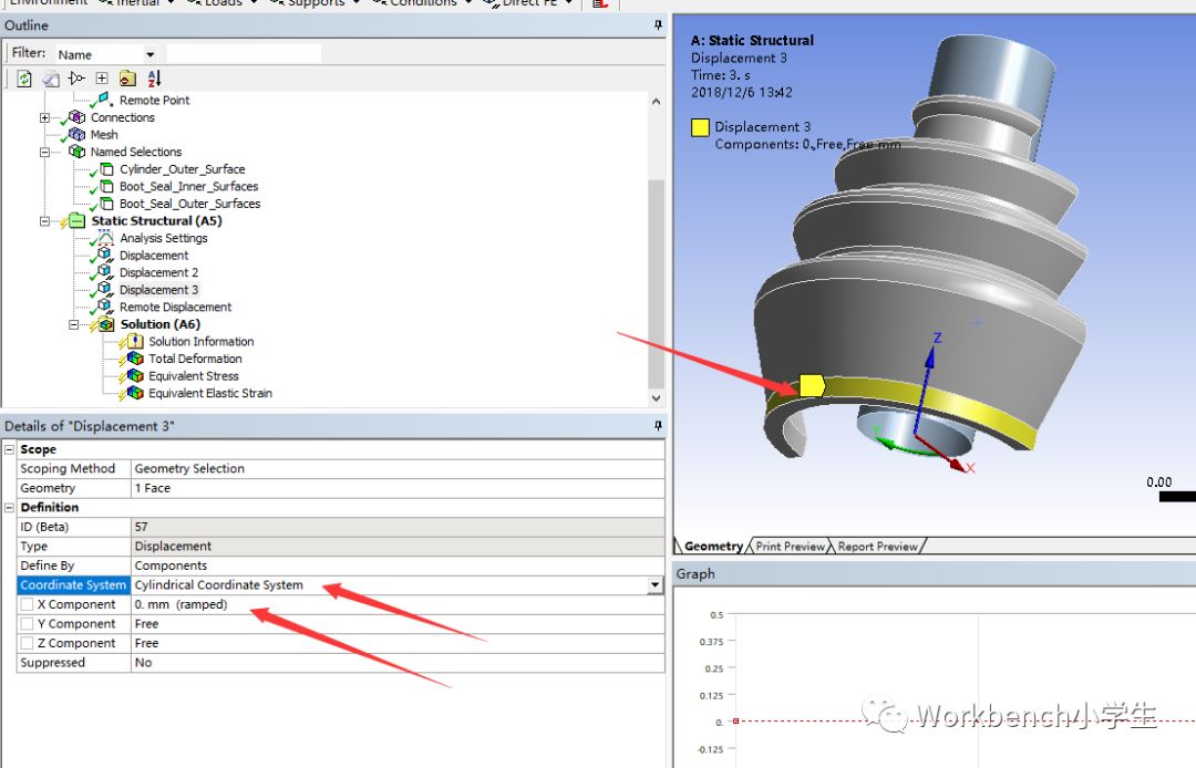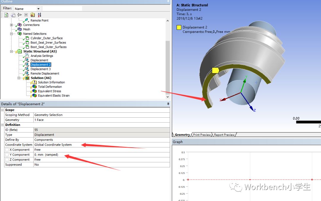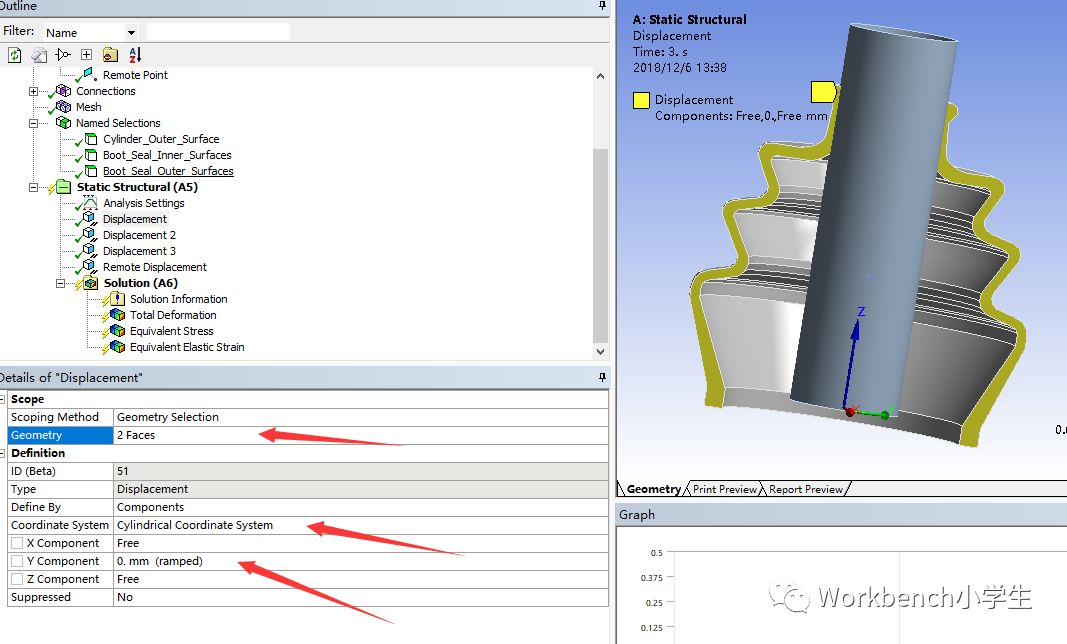在Supports中选择Displacement,Geometry中选择橡胶套密封的两个侧面,Coordinate System设置为Cylindrical Coordinate System,Y Component设置为0。