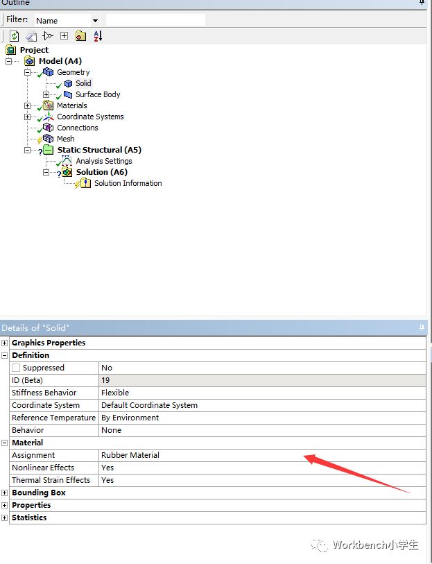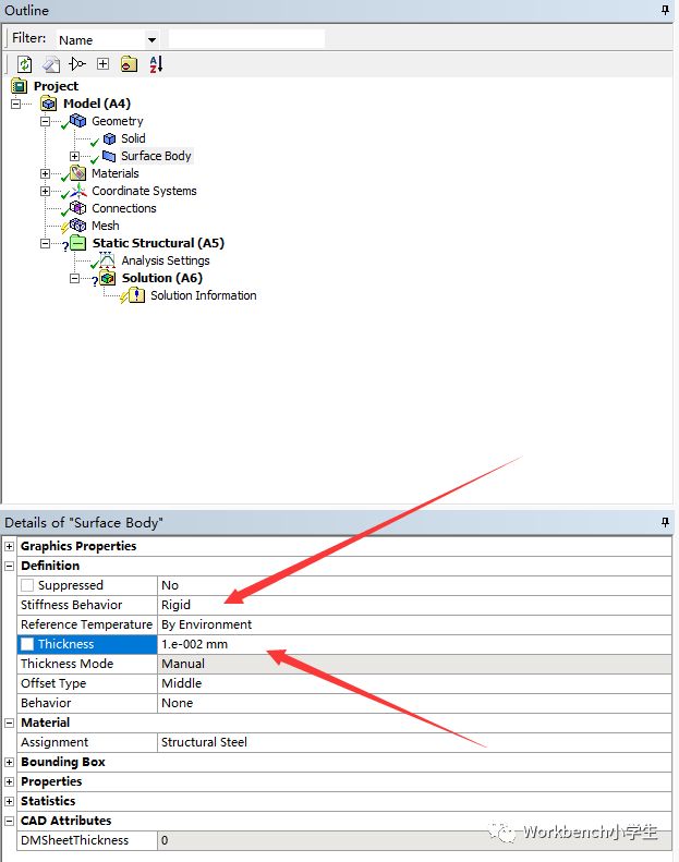 设置Surface Body的厚度为0.01mm,并定义为刚体,Solid设置材料为Rubber Material。
