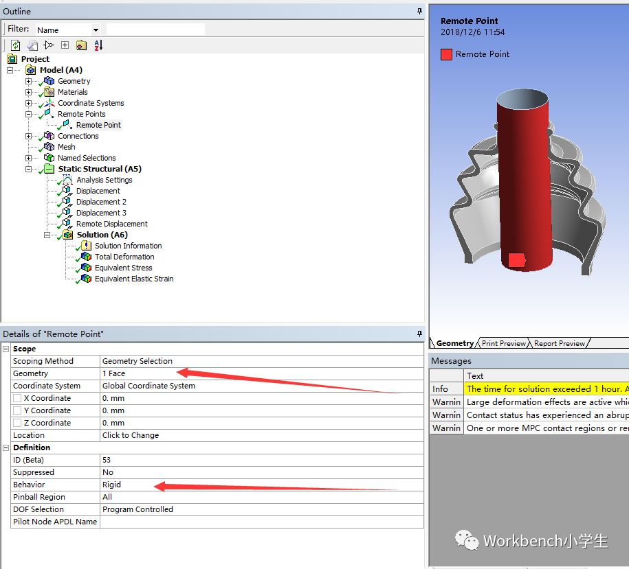 右键model,插入Remote Point。Geometry中选择圆柱表面,X Coordinate, Y Coordinate和Z Coordinate都设置为0,Behavior设置为 Rigid。