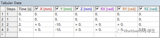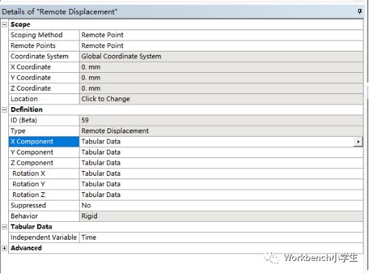 添加Remote Displacement,Remote Point设置为Scoping Method,Remote Point中选择Remote Point,设置X Component, Y Component, Z Component, Rotation X, Rotation Y和 and Rotation Z为Tabular,在右侧的Tabular Data中Y的第2步和第3步设置为-10,RZ中第3步设置为0.55 rad。