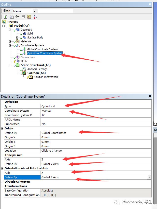 Type 选择为Cylindrical,Coordinate System选择为Manual,在Origin中Define By 选择为Global Coordinates,XYZ的值都为0。Principal Axis 中Axis选择Z,Define By选择为Global Y Axis,Orientation About Principal Axis中Axis选择为X ,选择Global Z Axis,并重新命名为Cylindrical Coordinate System。