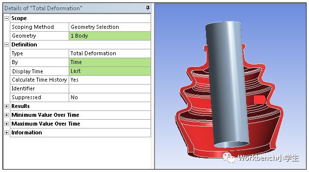 添加Total Deformation,Equivalent (von-Mises),Equivalent (von-Mises),在Geometry中橡胶套,并提交计算。