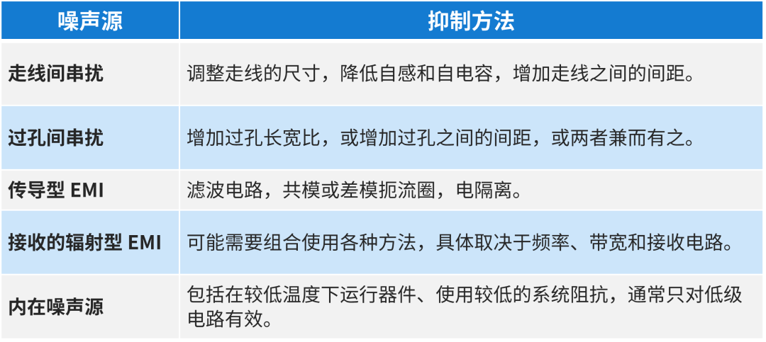 综上所述,没有哪种特定的技术可以抑制所有形式的噪声耦合。在系统中使用哪种具体的噪声耦合抑制技术,取决于所涉及的特定噪声源和电路间耦合的功率。我们通过下列表格对上文讨论的噪声源和抑制方法进行了简要总结。