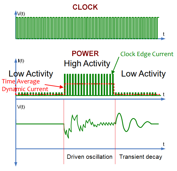 PDN 的阻抗决定了开关器件吸取的电流(上半图)和 PDN 上的电压(下半图)之间的关系