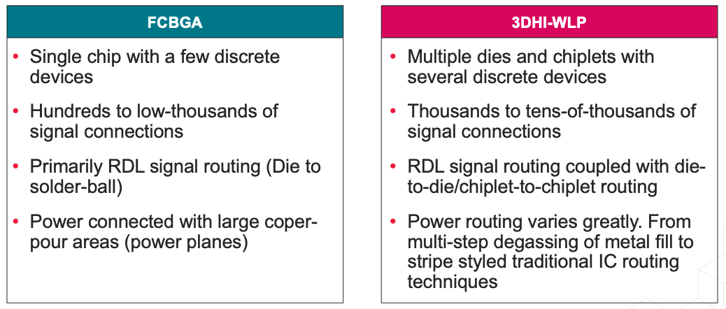 从上表中可以看出,如今的布线难度越来越大。左侧是倒装芯片球栅阵列 (FCBGA) 的要求,其中最多有几千个连接。RDL 信号布线将信号从相对较小的单个晶粒分散到焊球上。