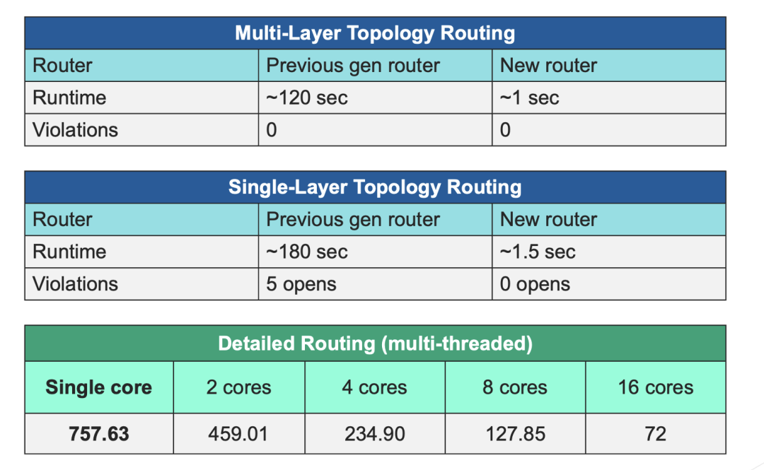 如上表所示,布线速度大大提升(100 倍)。使用多核心多线程详细布线也能使速度提高 10 倍以上。