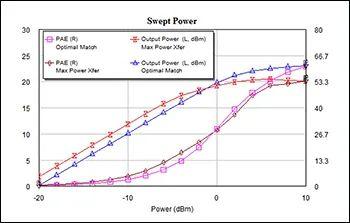 在实践中,更常见的情况是,功率放大器的设计要求晶体管要以牺牲 PAE 为代价实现共轭匹配。在这种情况下,负载牵引将是相对于最大功率传输,而不是相对于 PAE。这将产生一个最佳匹配,它不会对应于小信号 S22,但会给出一个阻抗,“牵走”小信号 S22。