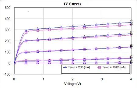 图 3:环境温度(蓝色,25℃)和高温(红色,100℃)下的 IV 特征。