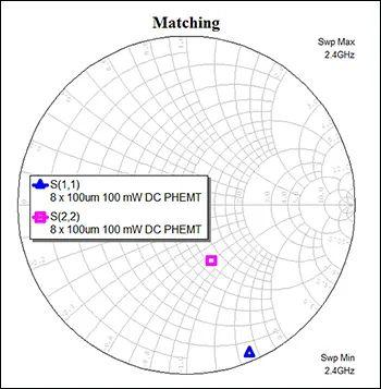 图 6:PHEMT 的输入和输出阻抗与 50Ω 不匹配,而且电容值很高。