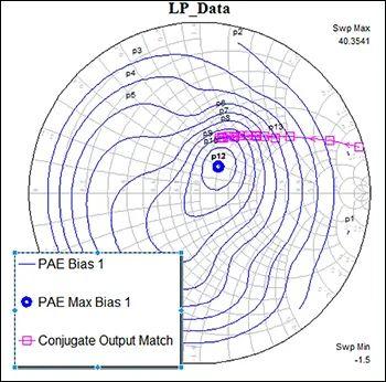 AWR Microwave Office 的负载牵引工具是一个很好的脚本,可以在设计中调用。图 4 显示了图 3 中所用器件的负载牵引等值线——PAE 的等值线与两个不同的偏置条件的比较。设计师可以根据直流耗散功率(即不同的偏置条件)和呈现给晶体管的不同(负载)阻抗(即负载牵引等高线本身),检查可用效率。从设计的角度来看,也许更重要的是同时使用模拟的负载牵引能力和晶体管与栅极偏置的共轭小信号输出匹配(图 5)。由于最大功率传输需要晶体管的共轭输出匹配,负载牵引等高线对设计流程十分重要,因为最大功率传输和 PAE 的交叉部分有助于实现一个功能良好的功率放大器。有一点需要注意的是:由于这个功率放大器已经被指定为从 P1dB“回退”的模式下工作,小信号 S22 可以用来代替测量值(使用该测量值可以得出大信号等值)。