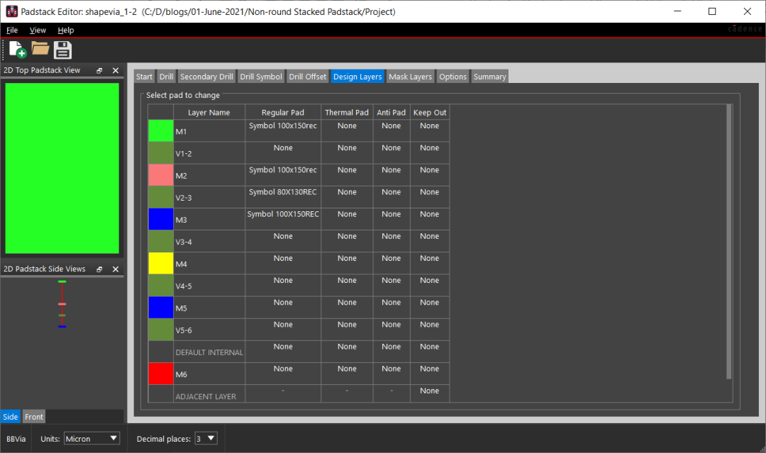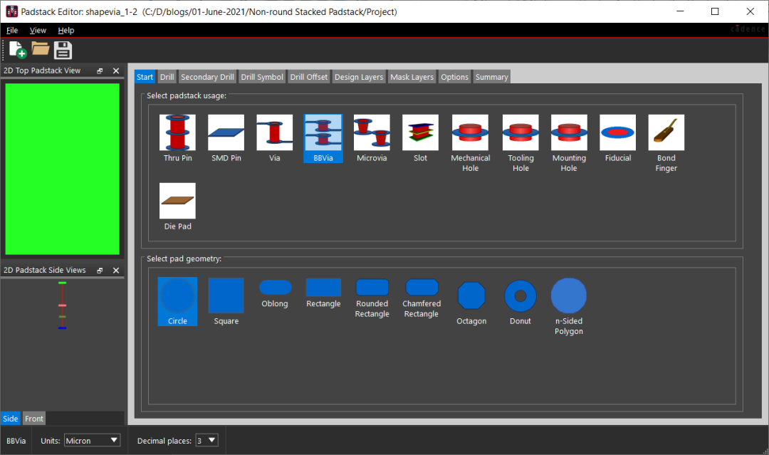 创建非圆形堆叠过孔的主要步骤是编辑焊盘,操作起来很简单。打开 .sip 文件,选择 Tools – Padstack – Modify Design Padstack。从 Options 选项卡中选择形状,然后点击 Edit。Padstack Editor 随即打开。在 Start 选项卡中选择 BBVia,然后以不同的名称保存该焊盘。