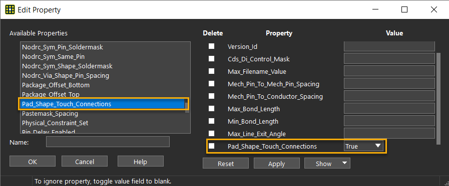 选择 Edit – Properties,在 Find 过滤器中将 Find By Name 字段设置为 Drawing。在 Edit Property 对话框中,将 Pad_Shape_Touch_Connections 属性设置为 True,然后点击 OK。