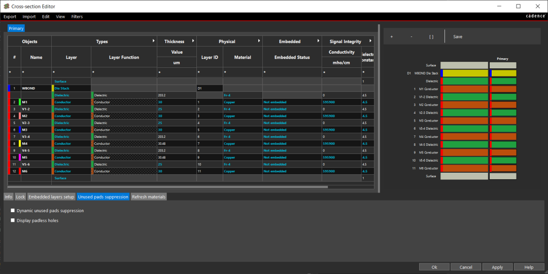 在这一步中,使用 File – Import 菜单中的 Techfile 和 Parameter 选项,导入层堆叠技术文件和参数文件。选择 Setup – Cross-section,打开 Cross-section Editor 并查看分层的层面。