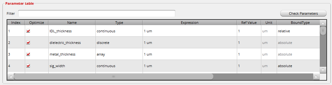 完成HBM 3D结构设计、仿真端口频率等设置后,在Optimality Explorer界面中勾选相关参与扫描的变量,并对变量取值范围进行定义。变量取值类型支持连接值、离散值、数组三种类型,如下图4。离散和数组类型是因为在生产中有些结构只有固定几种选项可以选择,比如:介质厚度、金属厚度。