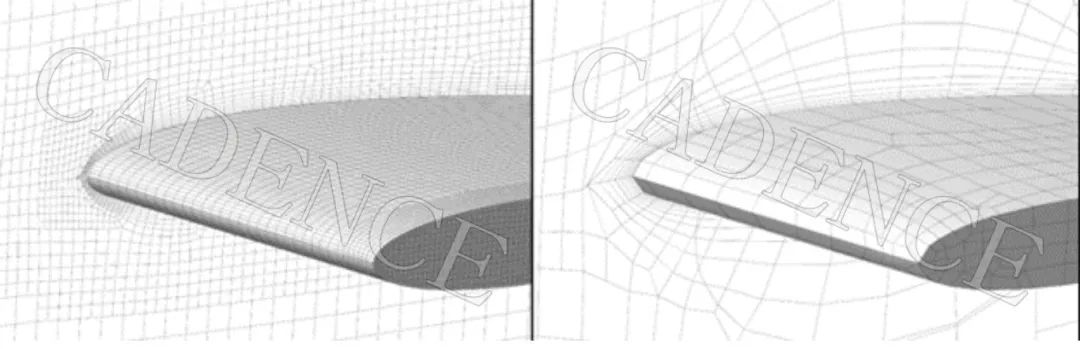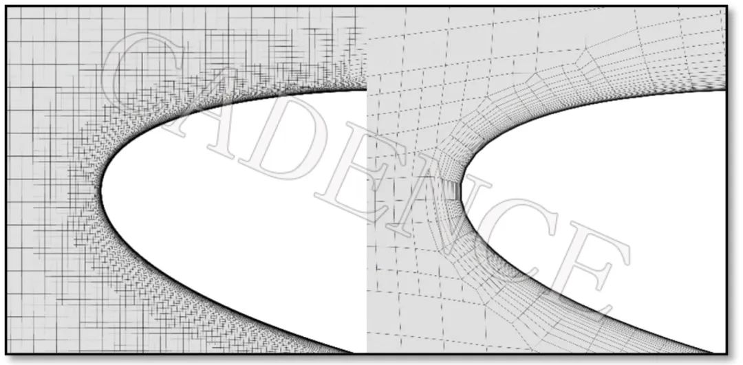 不过,粗网格也有一个缺点。如左图所示,非常密集的面网格加密会压缩粘性层,导致边界层厚度减少。另一方面,右图显示的是为 AGR 生成的更粗的网格,边界层的厚度要大得多。粗网格方案还会在粘性层中创建大区域大长宽比网格同时沿几何形状排列的边界层网格。通过观察右侧的网格,我们已经可以预知这样生成的网格精度会更高。