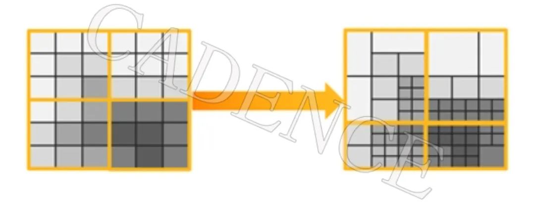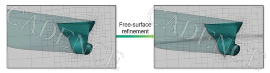 Fine Marine AGR 技术应用非常简洁。根据评估标准,对初始网格单元进行各向同性和各向异性网格加密。AGR 可以对自由液面处网格进行加密,以获得所需的网格精细尺度。左侧图片显示没有经过加密的自由液面网格,而右侧图片则显示了经过自动网格加密并达到合适网格尺寸的自由液面网格。
