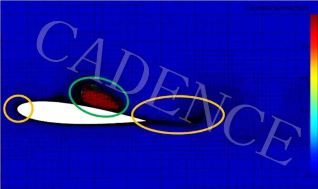 空化仿真需要引入一个全新的相——汽相,即水蒸汽。因此,空化仿真有三相,分别是液相、汽相以及自由液面。更重要的是流动属于复杂的非定常流,如下图所示的空化的脱落等非定常特征。此外,空化的仿真技术也高度依赖网格。为了正确捕捉空化的细节特征,必须在确定的区域保证网格的加密。这一过程非常耗时,且需要大量的技能和专业知识储备。