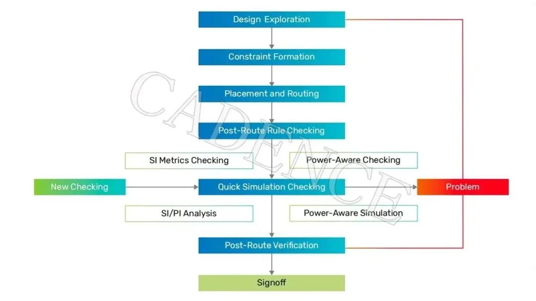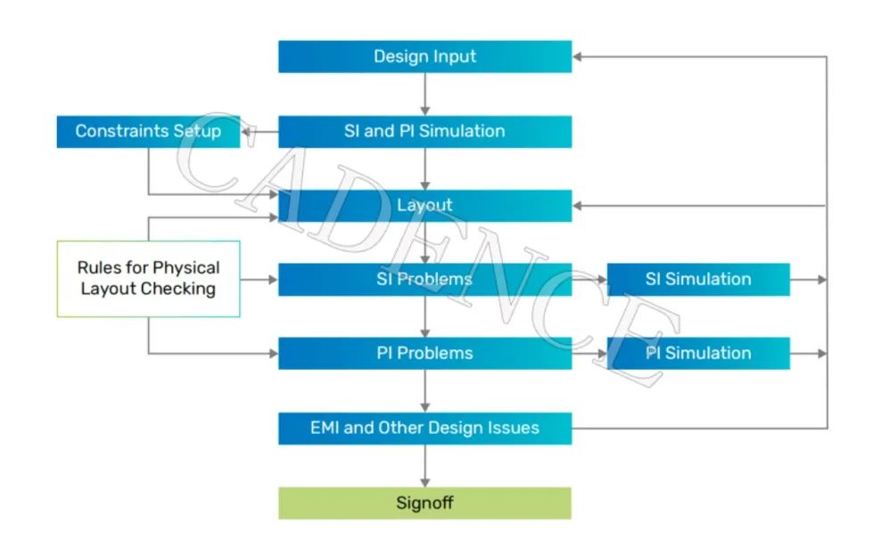 图 3 是 Cadence 兼顾电源影响的检查和仿真流程,这与传统的约束驱动的设计流程(图 4)形成了鲜明对比。传统的约束驱动的设计流程主要包含四个部分:预布局布线、约束形成、规则检查和布线后验证。