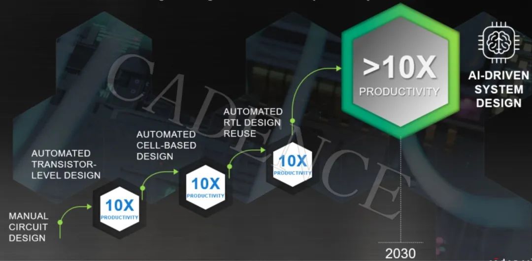 EDA 的核心就是自动化,从在定制工具中手工绘制电子电路,到 RTL Synthesis 和自动布局布线,每一步的创新都实现了 10 倍以上生产力的提升。现在,我们正处在电子设计自动化新时代的开始,我们计划为我们的客户实现另一个 10 倍的生产力提升。