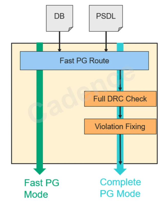 其中 flash PG 引擎工作时又分为两种模式,快速模式(fast mode)和完整模式(complete mode)。其中快速模式用于快速产生 PG,帮助工程师检查 PG pattern 是否符合设计要求并进行功耗分析;完整模式是在快速模式的基础上,工具尝试检查并处理 PG 产生的 DRC,希望可以在修理 DRC 的基础上保证 PG 连接性。工程师可以根据不同的需求场景,选择使用不同的模式,充分发挥 PSDL 的优势。