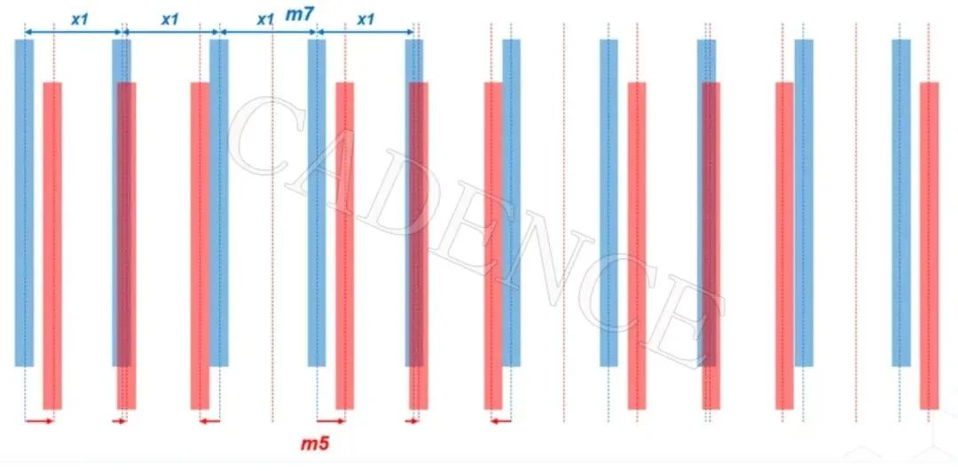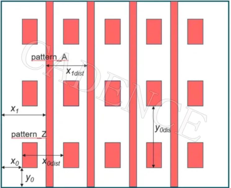 用于描述具体的一层中,所走金属线的类型及位置。如下图,表示在选定区域中,M3 上面vdd 使用前面定义的 pattern_Z(STAPLE类型)和 pattern_A(STRIPE)。其中初始偏移量、间距、数量可以由 OFFSET、STEPDISTANCE、SIZE 等进行定义。