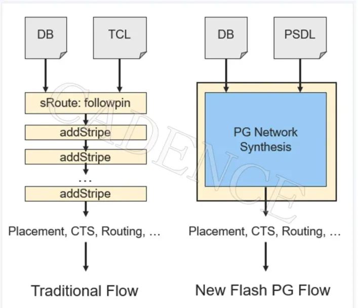 在 floorplan 阶段,读入完整的 PSDL 文件,然后调用 Innovus 内部的 flash PG 引擎,一次性生成 PG 网络。