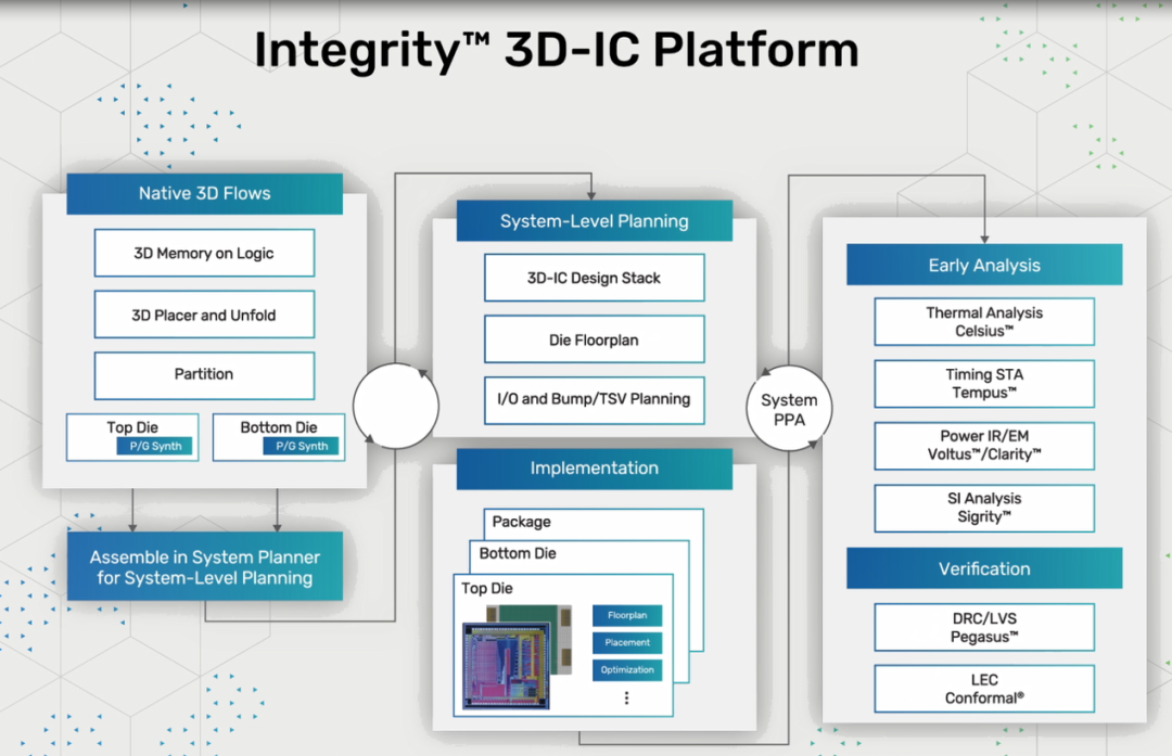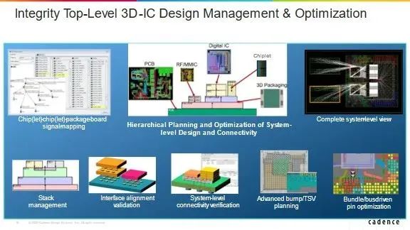 但伴随着 3D-IC 从一种可选的技术方案走向集成度或系统性能驱动的必选方案,如何提高原封装驱动的设计流程的自动化以及如何从系统角度得到全系统性能、功耗、面积、散热的最优化设计已经变得越来越重要。并且在此基础上还要考虑不同 3D 制造、封装方案对系统设计的影响。再考虑到设计不同阶段和不同步骤的设计意图交互和数据交互以及 ECO 需求,这一切都不是原有基于不同设计团队的不同点工具所能轻松解决的。