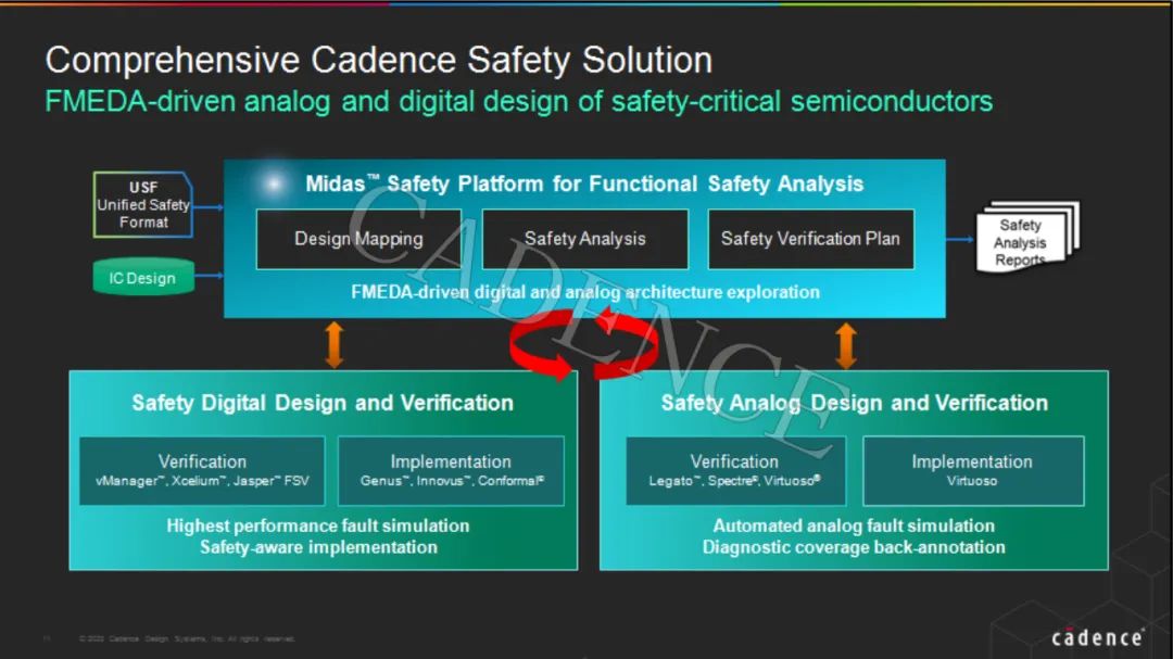 安全解决方案的核心是新工具 Midas,本地集成了从数字到定制以及从设计到验证的完整流程,为 ISO 26262 认证提供完整的 FMEDA 管理。Midas 的 FMEDA 计划可以在验证流程中推动全面的故障活动、数字验证和实现平台,包括 Xcelium 并发故障模拟、Jasper 形式故障可达性、Genus 综合的自动安全机制插入,以及 Legato 高级老化模拟缺陷分析。