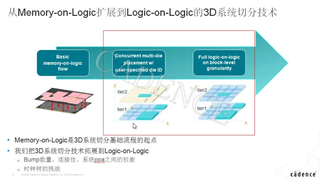 他提到,3D-IC 早期系统分析及签核流程包括:用于早期轨(功率和热)分析的 Voltus™/Celsius™、导流Integrity™ Flow Manager,以及时序分析Tempus™。Cadence 从 Memory-on-Logic 扩展到 Logic-on-Logic 的 3D 系统切分技术将 Memory-on-Logic 作为 3D 系统切分基础流程的起点,实现了 Bump 数量、连接性、系统 ppa 之间的权衡,解决了时钟树的挑战。