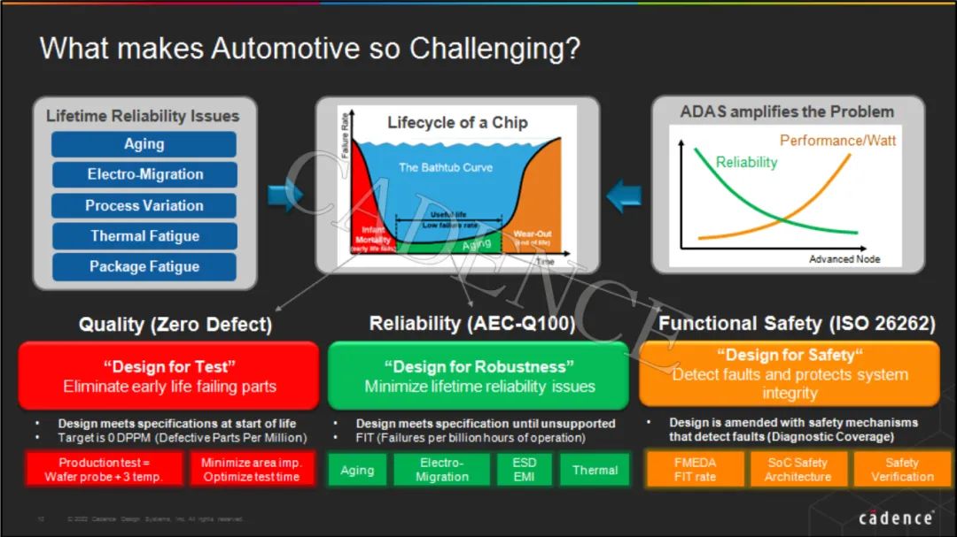 陈会馨说,汽车无疑是最具挑战性的垂直领域。为了避免昂贵的召回,汽车行业有非常高的质量标准,目标的百万分之次品率是 0。15 年长产品生命周期,要求老化和电迁移问题要在设计中解决。Cadence 提供 Legato 和 Voltus 等专用工具,可以在流片前解决设计执行的一系列电气和物理签核和验证步骤。