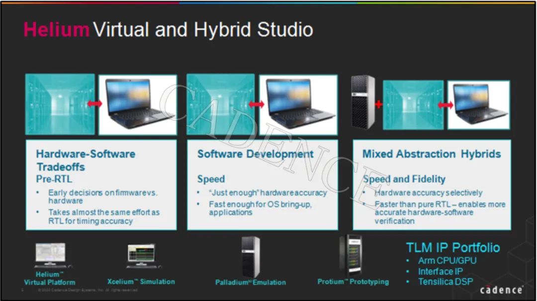 陈会馨介绍说,为了提供大量预先建的 IP 虚拟模型,全面支持硬件平台快速组装,Cadence 推出了原型验证平台工具 Helium,以解决硬件-软件协同验证和协同调试难题。