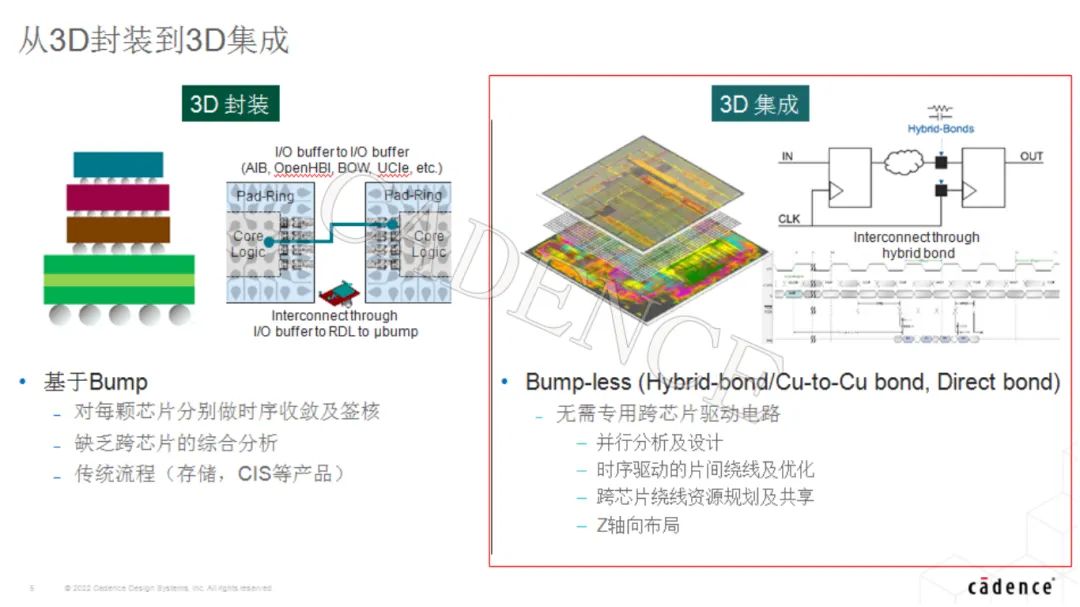 在 3D 集成方面,Bump-less(Hybrid-bond / Cu-to-Cu bond、Direct bond)无需专用跨芯片驱动电路,可以实现并行分析及设计、时序驱动的片间绕线及优化、Z 轴向布局,以及跨芯片绕线资源规划及共享,可谓一举多得。
