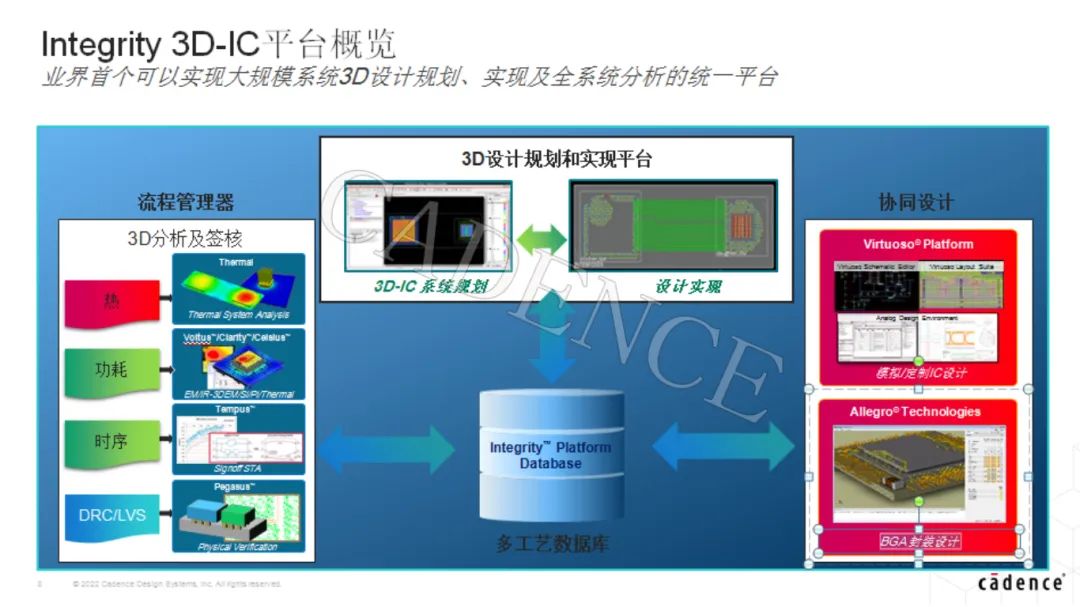 李玉童说,Cadence Integrity 3D-IC 是业界首个可实现大规模系统 3D 设计规划、实现及全系统分析的统一平台。它基于多工艺数据库,利用流程管理器实现 3D 分析及签核;以 3D 设计规划和实现平台 完成 3D-IC 系统规划和设计实现;协同设计有助于模拟 / 定制 IC 设计和 BGA 封装设计。