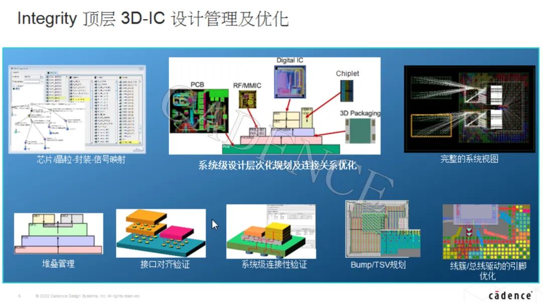 他介绍说,通过 Integrity 顶层 3D-IC 设计的管理及优化,能够实现系统级设计层次化规划及连接关系优化,以及芯片/晶粒-封装-信号映射,获得完整的系统视图,同时实现堆叠管理、接口对齐验证、系统级连接性验证、Bump / TSV 规划以及线簇/总线驱动的引脚优化等功能。