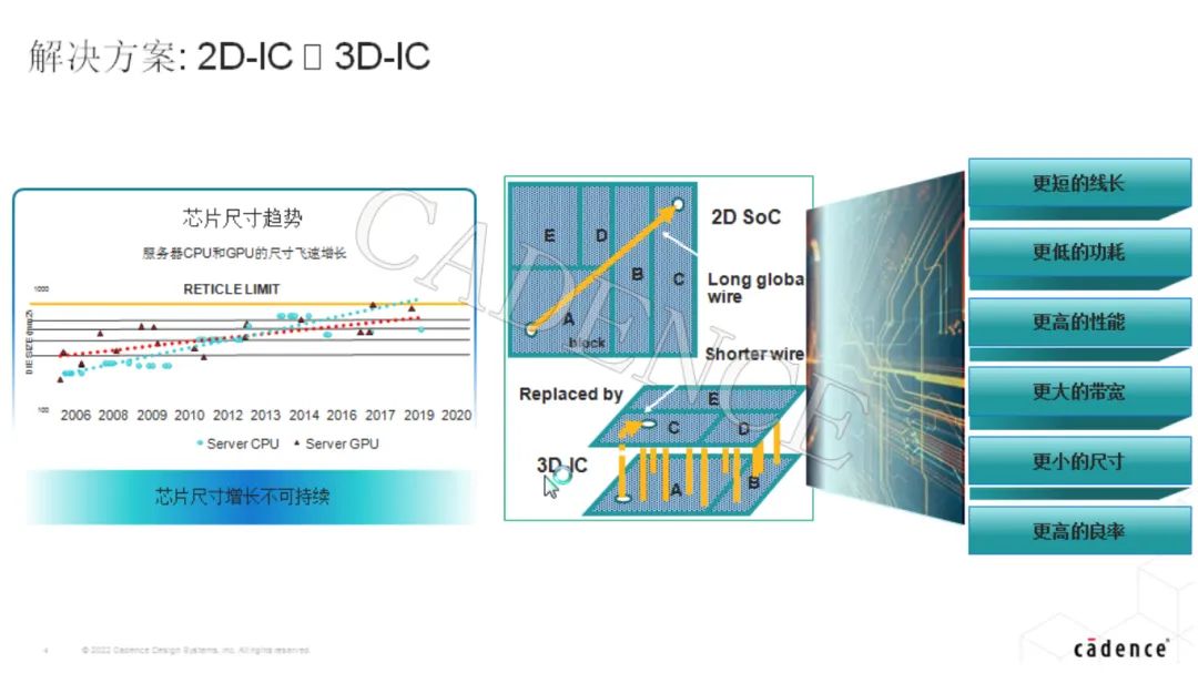 2D-IC 和 3D-IC 解决方案同样面临着挑战,服务器 CPU 和 GPU 芯片尺寸增长的趋势在飞速发展,但芯片尺寸增长的不可持续性已经显现;2D SoC 的长全局走线正在被 3D-IC 中更短的线长所取代。