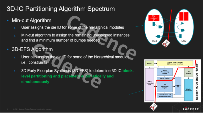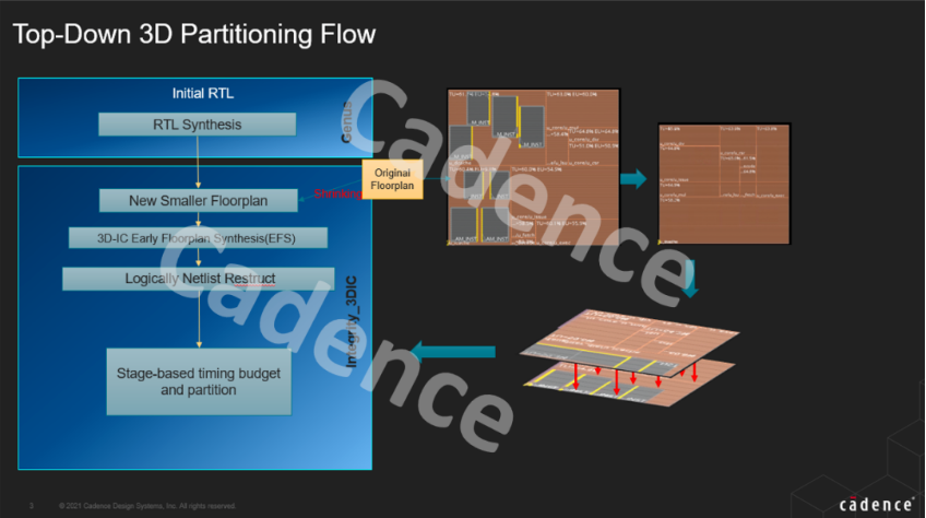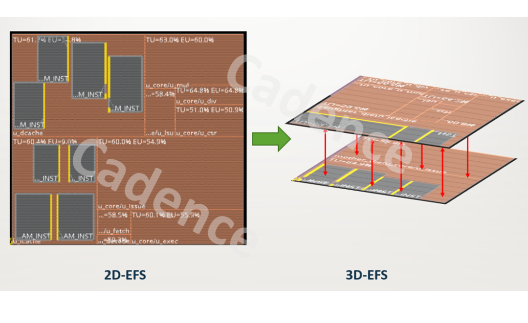 基于 EFS,Integrity 3D-IC 进一步增强并推出了三维布图综合功能,在三维空间内对模块进行自动布局,并且进行各模块的形状调整,从而优化芯片面积,线网长度和层间过孔数据。另外,Integrity 3D-IC 还支持用户预分配模块到某层芯片或者预摆放到某个位置。
