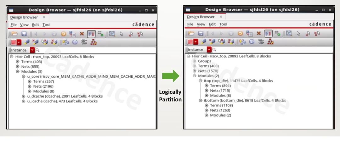 基于三维空间模块布局的结果,Integrity 3D-IC 会将原来二维的网表进行层次化结构的重建,在系统顶层产生 Top Die 和 Bottom Die 两个层次化结构,把各个模块分配给上层芯片和下层芯片,得到新的三维集成电路的网表。在此过程中,Integrity 3D-IC 可以自动创建上层芯片与封装 PKG 相连所需要的 Feed Through,并且更新系列相关的时序约束信息、翻转计数格式文件等。