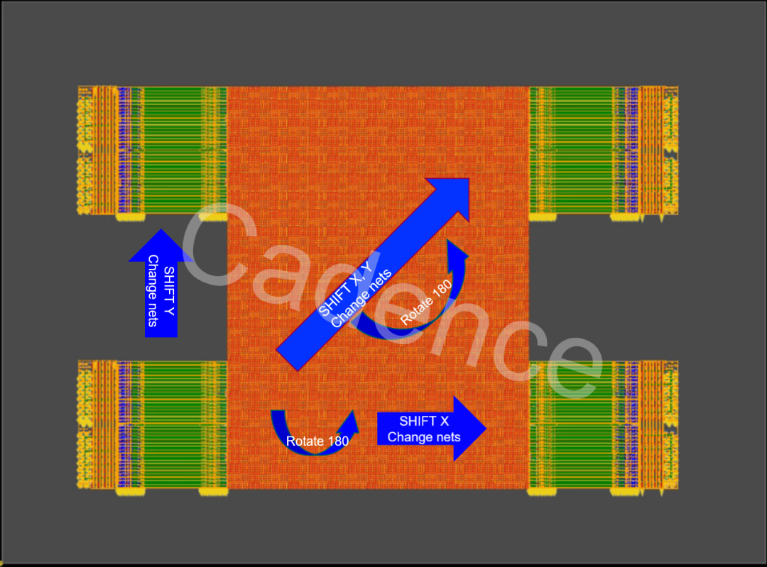 虽然我们强烈推荐用户使用全自动布线以实现分钟级的快速布线,Integrity 3D-IC 也提供强大友好的编辑复 制功能。但在一组 Bump 布线完成后,用户可以对这组布线进行眼图仿真,当 SI/PI 都达到指标后,用户可以选中这一组的线和过孔,通过灵活的平移、翻转、旋转的动作把线和过孔复 制到另一组 Bump 上,Integrity 3D-IC 会自动对目标 Bump 完成同样的布线连接。