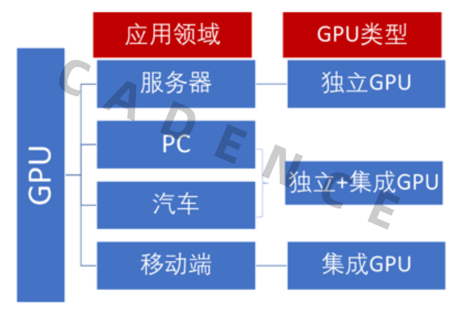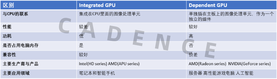 在不同的应用领域中,根据其工作特点,衍生出不同类型的 GPU,如图 1-2 所示,主要分为独立 GPU 和集成 GPU,独立 GPU 拥有独立显存,一般作为一个独立的组件封装在显卡电路板上,它的特点是性能高,具有较强的专业图片处理能力,提供较高的计算速度,所以独立 GPU 一般较多地应用于重计算的服务器、高性能游戏电脑、人工智能等;而集成 GPU 常和 CPU 共用一个 Die,共享系统内存。它的特点是注重能效比,即可以牺牲一定计算速度的条件下,尽可能地节省空间和功耗,这也是由便携式的移动设备一直追求的更轻更强续航能力。图 1-3 是关于集成 GPU 和独立 GPU 的对比: