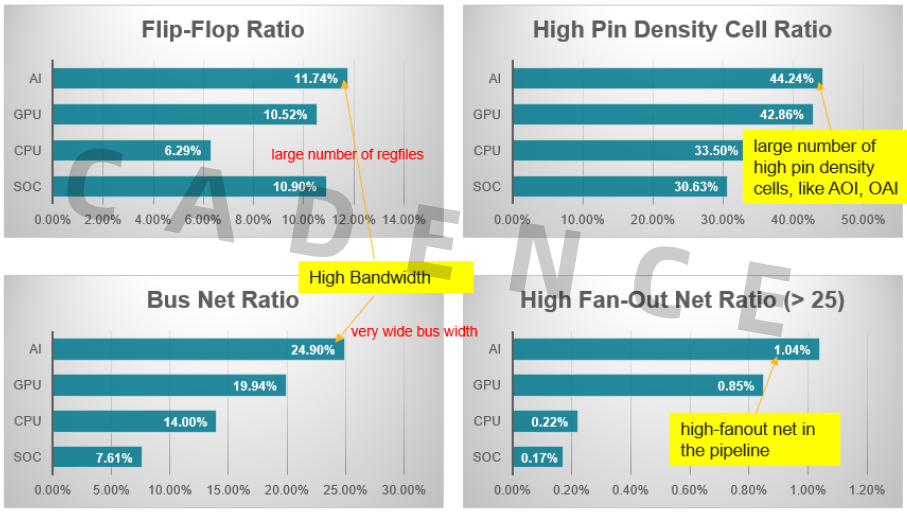 在这种计算密集度越来越高的情况下,我们也面临越来越严峻的挑战,比如在后端摆放和绕线阶段的拥塞问题,如何比较精确地在较早阶段考虑物理信息,提 前预测 RTL 的质量,还有提前 预测布局变得尤其重要;在并行同步的信号会增多,大量的矩阵运算引入的情况下,Glitch Power 占比会显著提高,如何在较前阶段去分析和避免 Glitch 功耗是我们避不开的难题;同时由于 GPU 重运算和流水线的设计加上众多旁路分支结构,OCV 影响会更加显著,如何评估和解决时钟上 OCV 是解决时序收敛的关键因素。