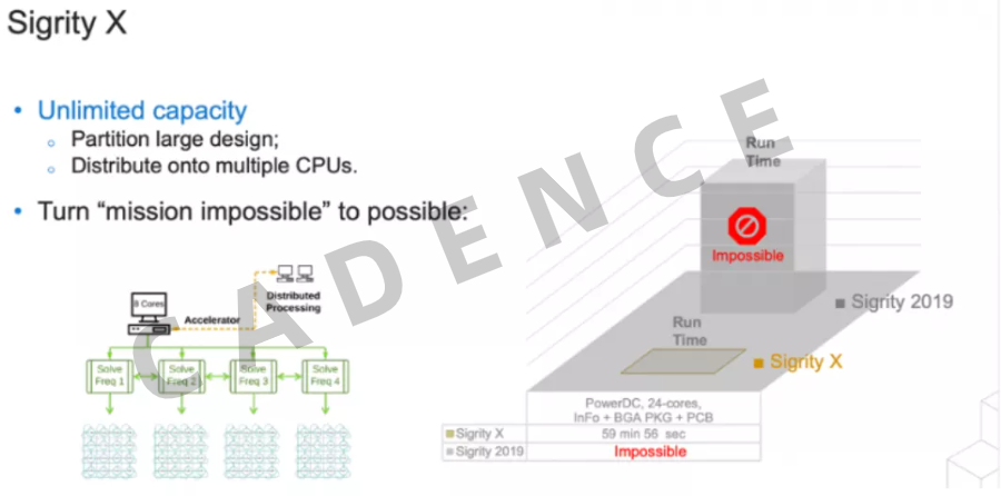Ben Gu 强调了 Sigrity X 的“分布式”理念:Cadence 对设计数据库进行了大规模的并行化处理,也就是说,可以将一个规模庞大的设计项目分割成很多小的部分,然后让多个计算机对分割出来的子项目进行协同仿真,这样既能够提升性能和容量,又确保仿真精度没有任何损失。