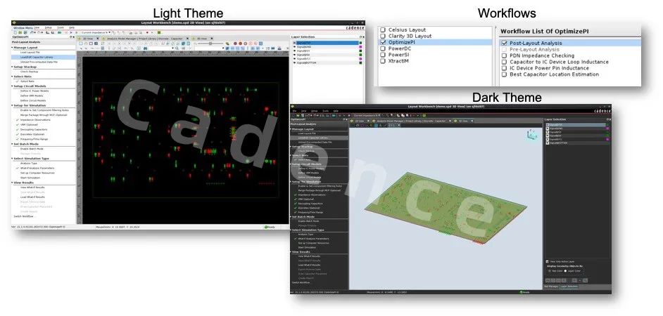 Sigrity X 技术可适用于 Sigrity 系列产品:PowerSI、PowerDC、XtractIM、SystemSI 和 OptimizePI。但是,以上并不是最新版 Sigrity 的唯一变革——Sigrity 全新的用户界“Layout Workbench”非常易于使用。可根据您的喜好,变更成亮色或深色主题画面(正如同手机操作),也可取决于您所在的位置和一天中的时间做出调整——与 Clarity 3D Solver 所提供的 GUI 相同。
