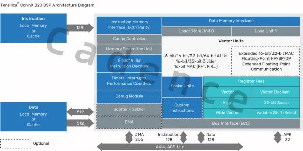 作为 ConnX 系列时钟速度最快的产品,ConnX B10 和 B20 DSP 支持可选的 32 位矢量定点 MAC,可被用于加速 FIR、FFT、卷积运算和相关运算等雷达/激光雷达/V2X 相关的处理功能。双精度、单精度以及半精度矢量浮点操作也可以通过硬件进行加速。