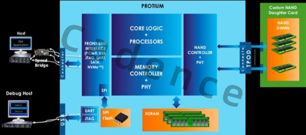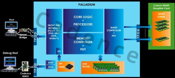 以 Palladium 为核心搭建起来的硬件仿真环境,可以实现端到端测试(在 PC 主机上运行的应用软件可以访问到实际的 NAND 存储器)。